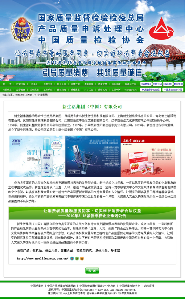新生活集團(tuán)成立16年來(lái),一直以優(yōu)質(zhì)的產(chǎn)品質(zhì)量和優(yōu)秀的企業(yè)形象屹立在中國(guó)化妝品界,產(chǎn)品先后獲得了國(guó)家及地方多項(xiàng)名優(yōu)、名牌、誠(chéng)信及消費(fèi)者滿意產(chǎn)品榮譽(yù)。此次活動(dòng)中,新生活集團(tuán)對(duì)產(chǎn)品質(zhì)量和服務(wù)質(zhì)量再次作出了鄭重承諾。不久,新生活集團(tuán)將開(kāi)通“全國(guó)客戶服務(wù)中心”專(zhuān)線,充分保證新生活產(chǎn)品質(zhì)量反饋和監(jiān)督渠道暢通,向顧客提供更加高效優(yōu)質(zhì)的服務(wù)。