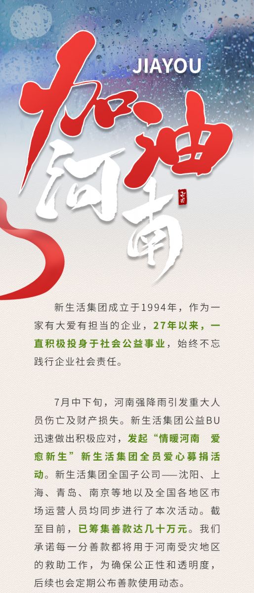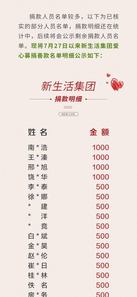 “情暖河南 愛愈新生”新生活集團全員愛心募捐善款明細(xì)公示